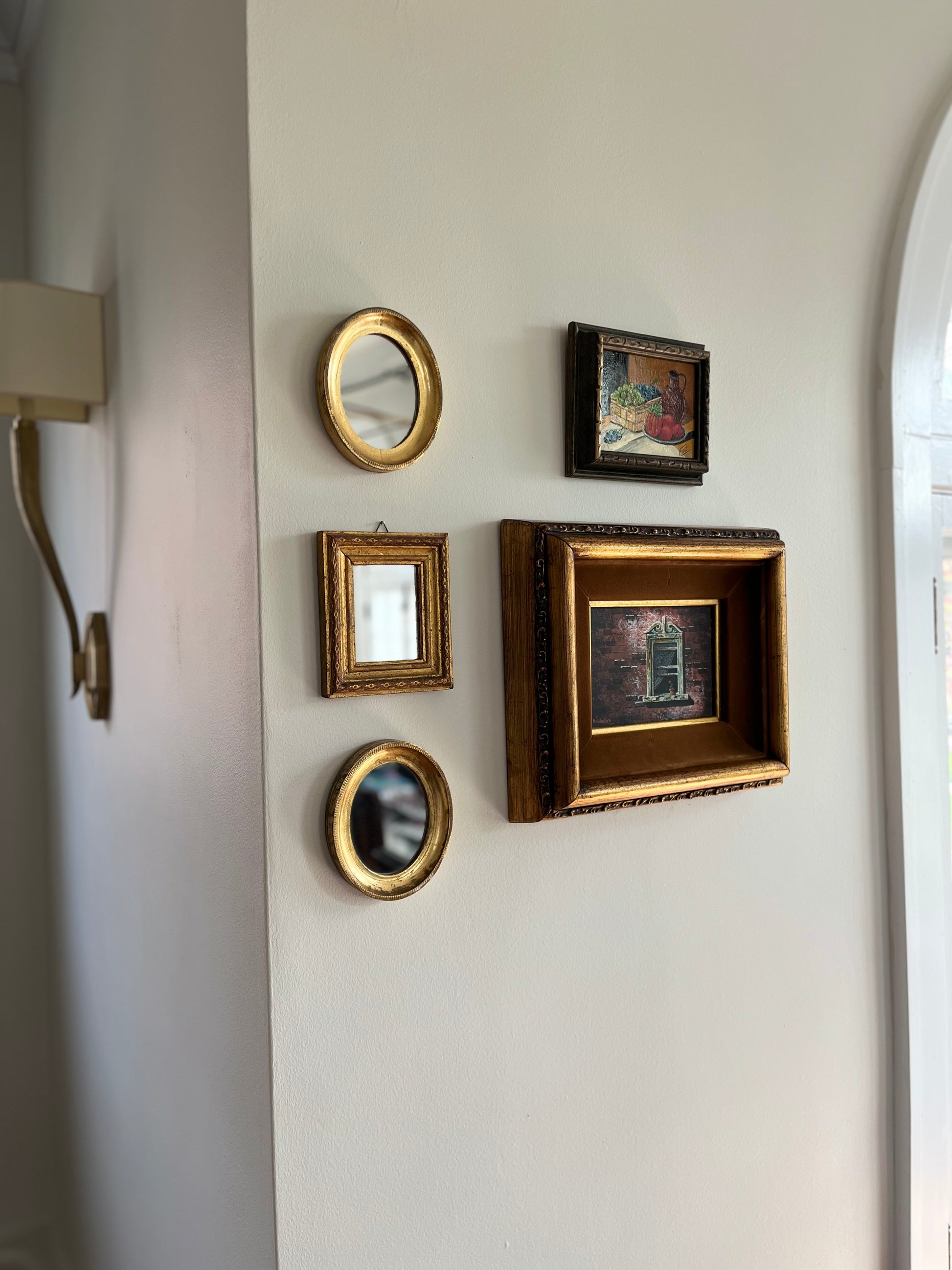 Found in an antique store on the Maryland coast, this charming trio of Italian gilt wood mirrors brings timeless elegance to any space. The set includes two oval mirrors and one rectangular mirror, all crafted with vintage gilded frames that exude old-world charm. Lightweight and easy to hang, they offer endless versatility — perfect for adding a touch of sophistication to any room.