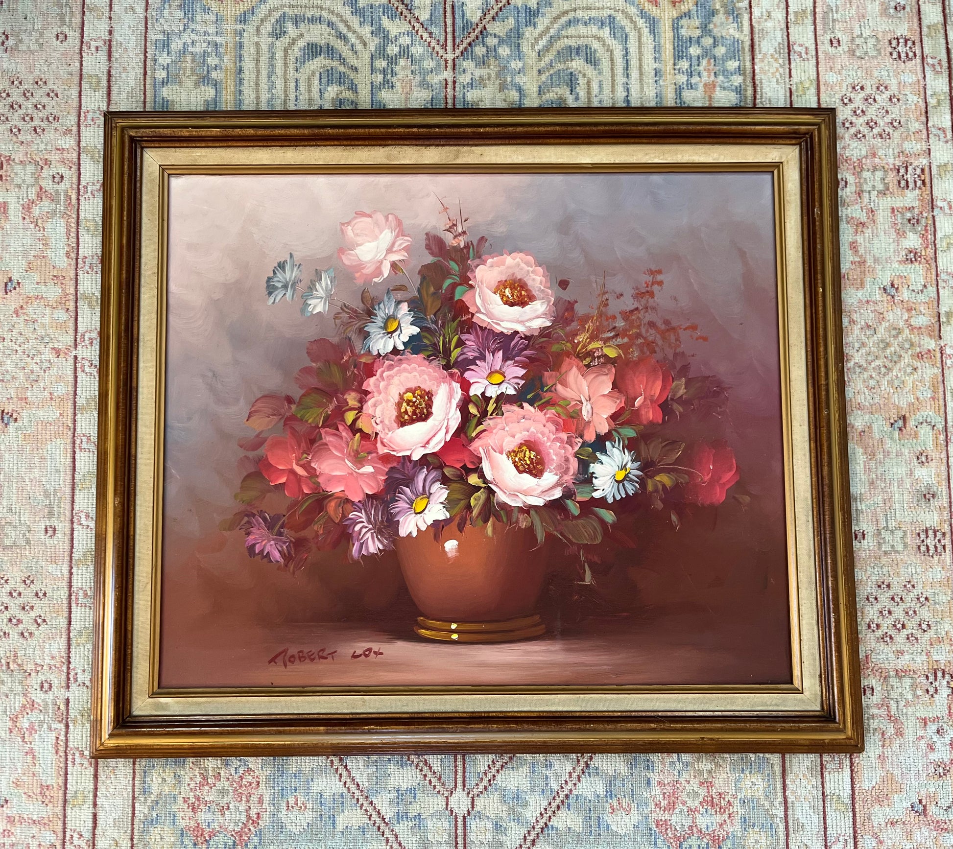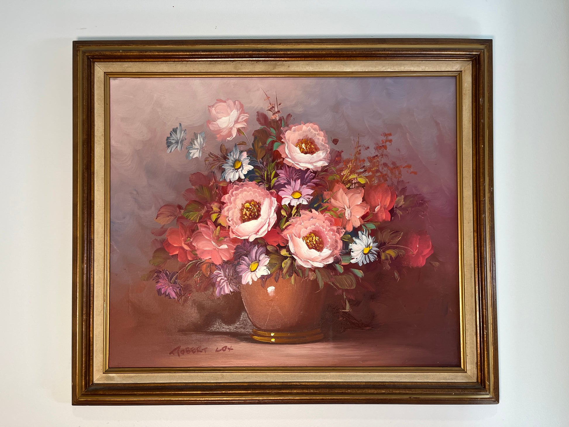 Vibrant and captivating, this Robert Cox still life floral painting bursts with stunning shades of pink, blue, mauve, and a striking pop of burnt orange on the vase. Every glance reveals new details, making it a truly engaging work of art.