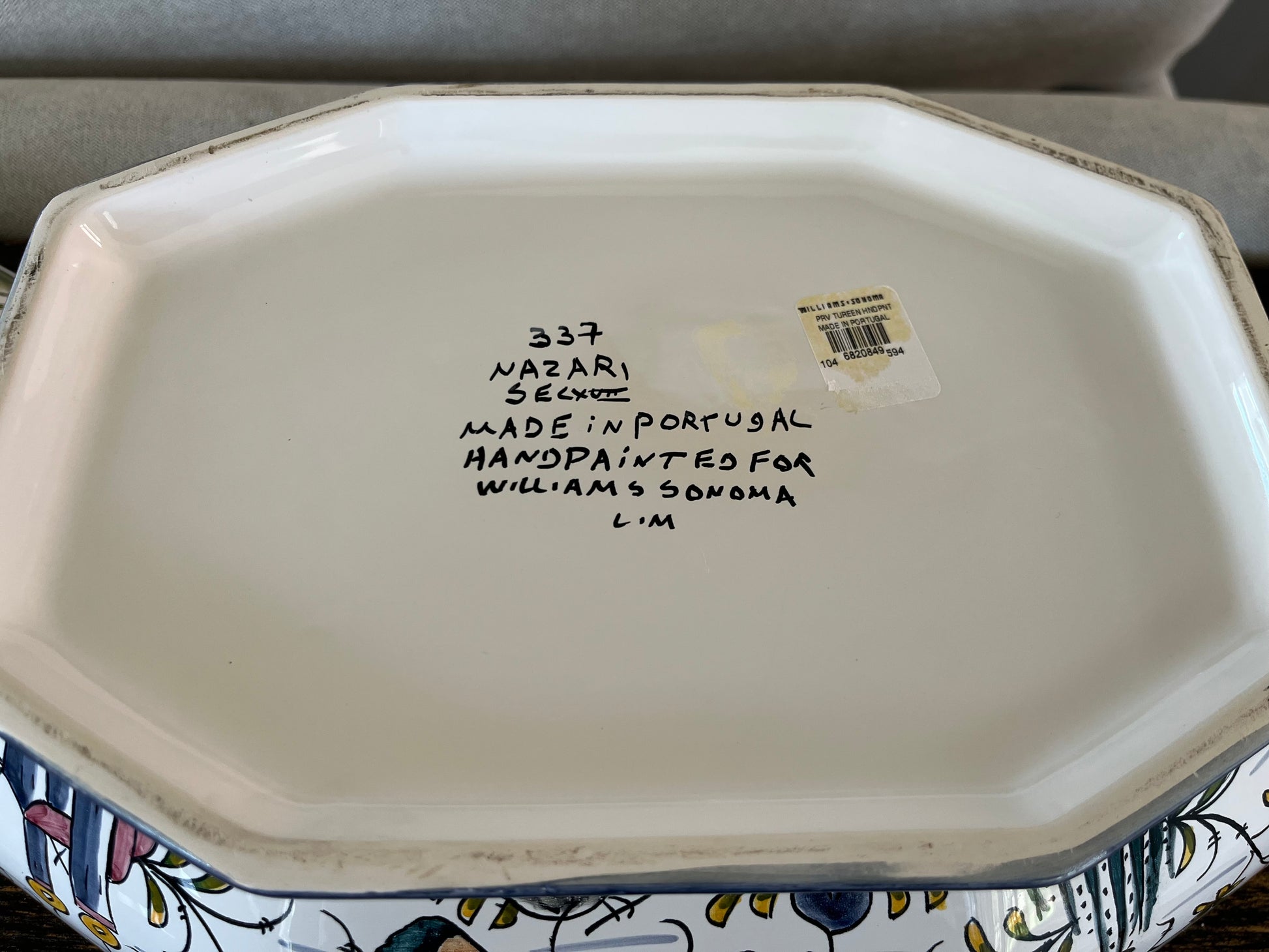 The Williams Sonoma Nazari Tureen with Lid, handcrafted in Portugal, is a cherished piece from the Provence collection. This vintage tureen showcases intricate hand-painted designs, often featuring scenes inspired by 17th-century Portuguese folklore, such as castles and forests. The piece is signed and marked with "Made in Portugal," highlighting the artisanal craftsmanship.
